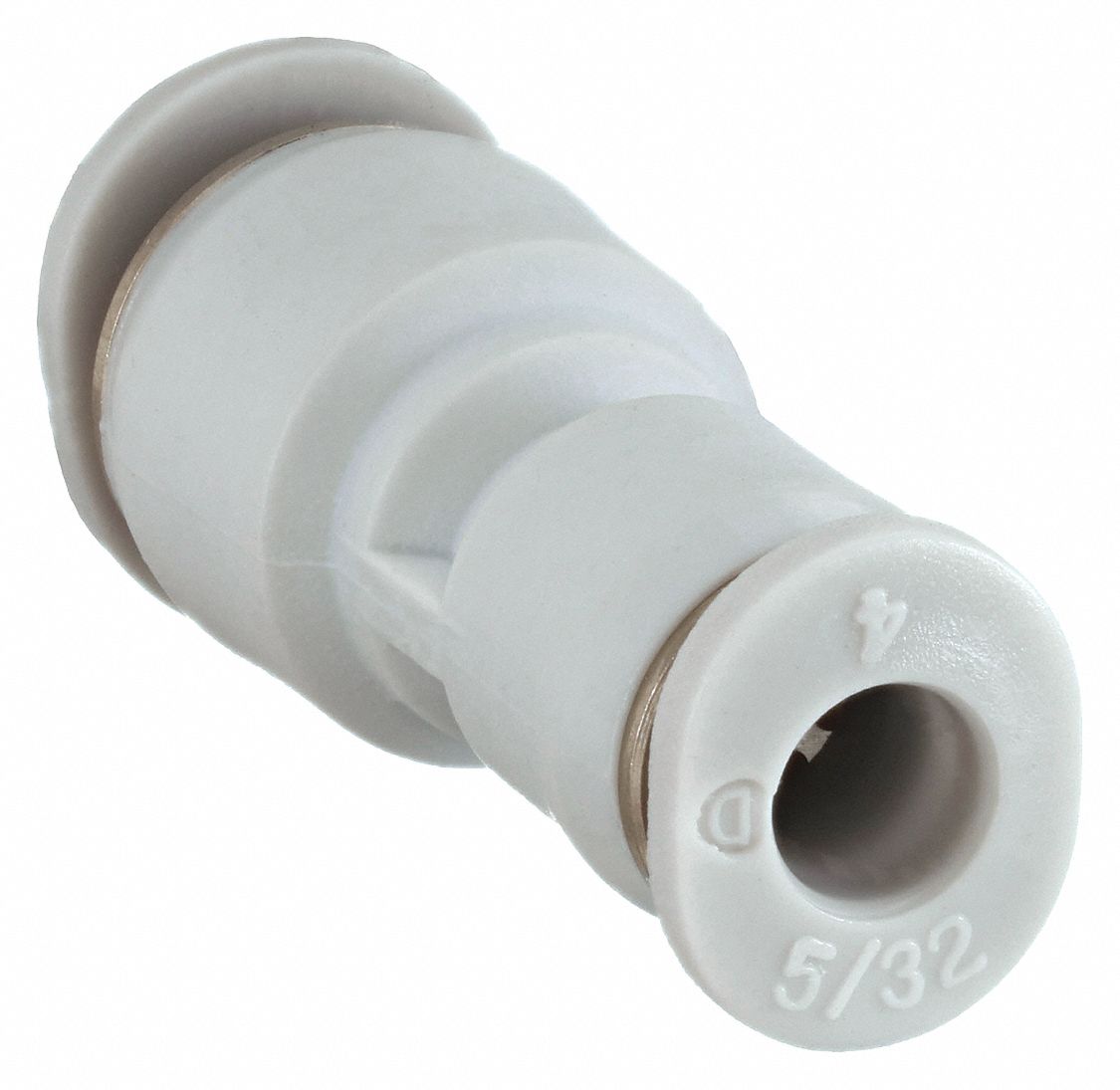 'Reducing Straight Union, Tube Fitting Material Polybutylene, Fitting Connection Type Tube, Tube Size 5/32 In. x 1/8 In., Max. Pressure 150 psi, Color White, Temp. Range 32 Degrees to 140 Degrees F, Package Quantity 10'