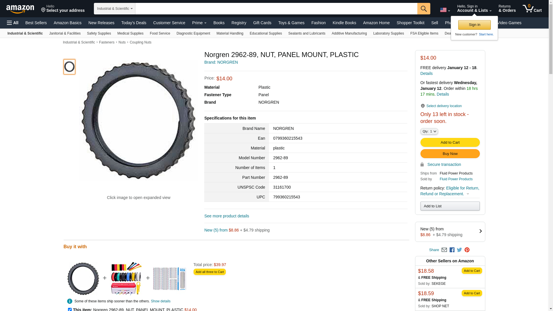| Feature | Norgren 2962-89, NUT, PANEL MOUNT, PLASTIC |