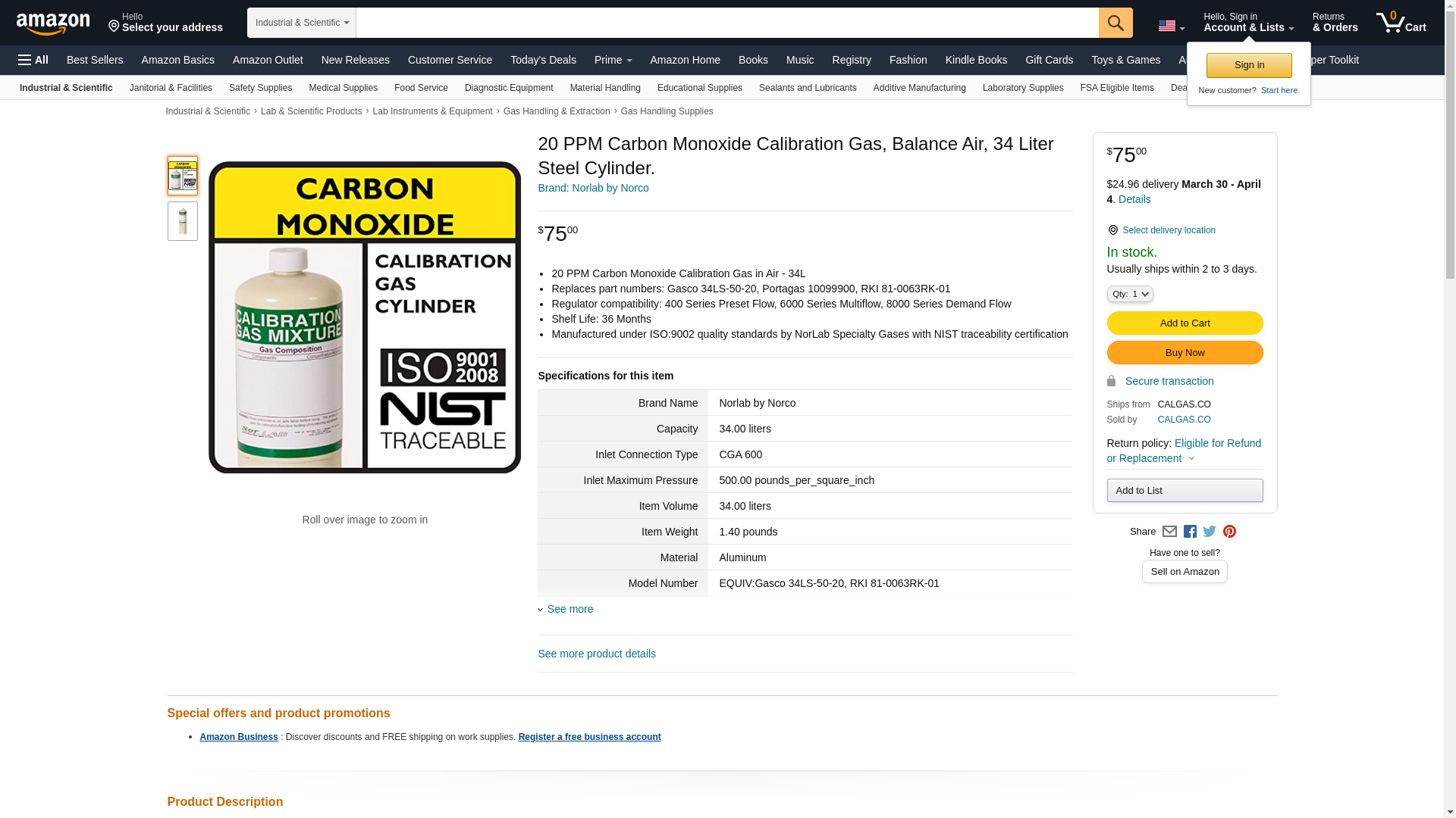 | Feature | 20 PPM Carbon Monoxide Calibration Gas in Air - 34L |