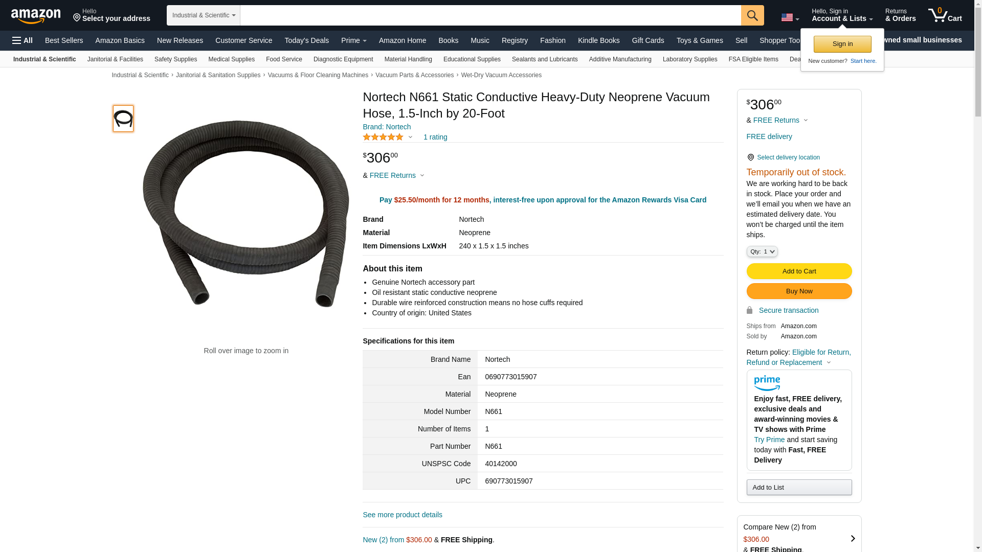Nortech N661 Static Conductive Heavy-Duty Neoprene Vacuum Hose, 1.5-Inch by 20-Foot