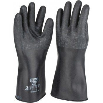 R.S. Hughes carries a large selection of product shapes and sizes to help best meet your specific applications. Width, length & height are some of the more common measurements to consider. This product has a 14 in length. The North chemical-resistant glove is packaged 12 pair per pack, 72 pair per case, comes in black and meets 29 CFR 1915.157, EN 420, MIL-DTL-43976D standards. R.S. Hughes sells a large variety of gloves designed for a variety of conditions and situations. This particular glove is made with butyl, offers a beaded cuff and with rough leather grade. Proper sizing is important when buying this part. The size for this product is 10.