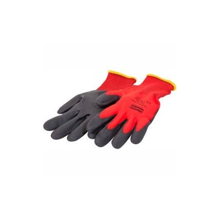 Lightweight, 15 gauge nylon glove with foam PVC coating on palm and fingertips, no coating on back of hand for added ventilation. Red nylon and black PVC.