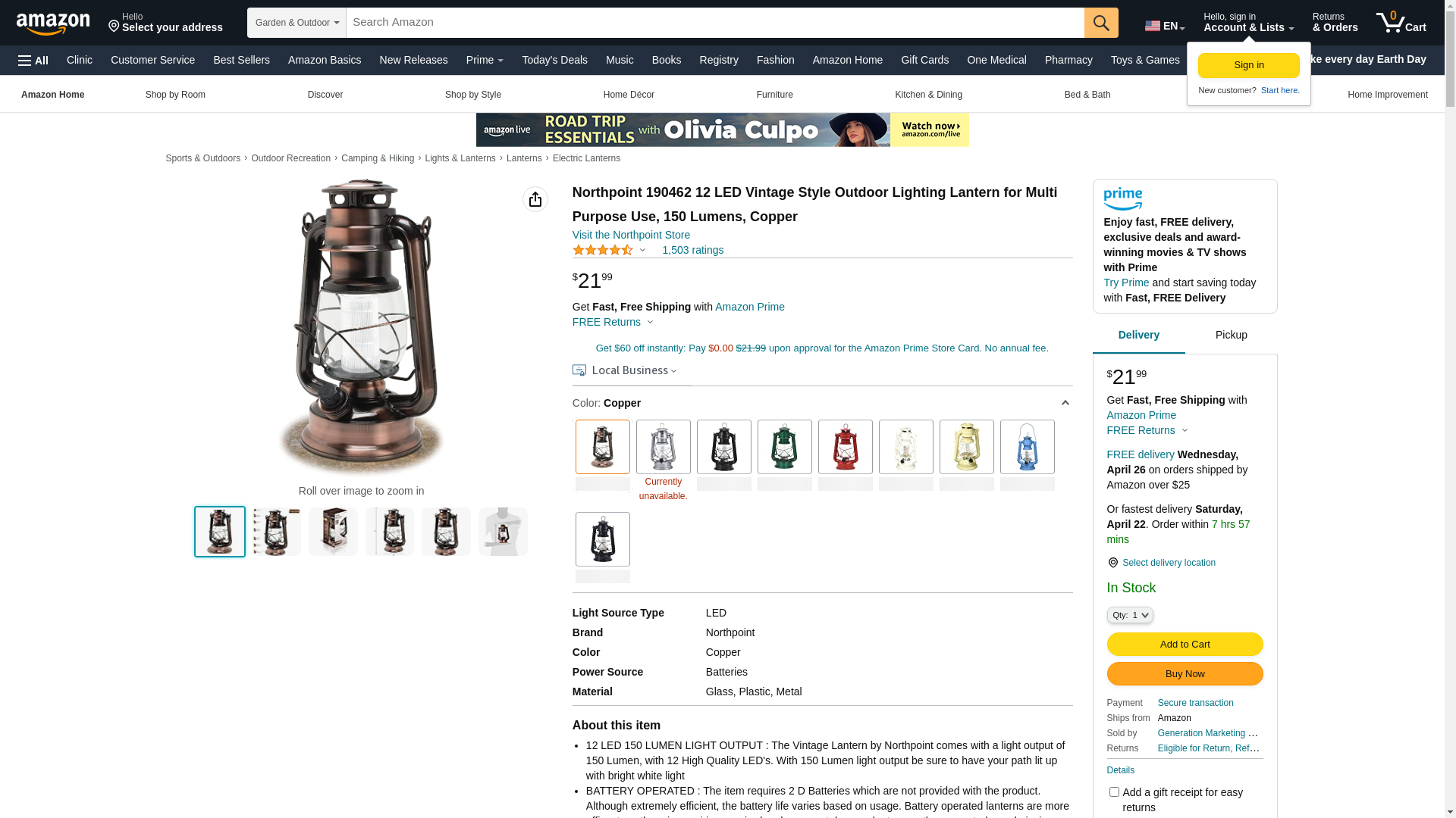 Northpoint 190462 12 LED Vintage Style Outdoor Lighting Lantern for Multi Purpose Use, 150 Lumens, Copper