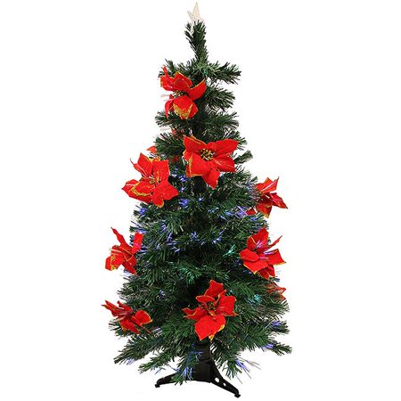 This stunning fiber optic tree features red velveteen poinsettia flowers that are accented with sparkling gold glitter- Tree is finished off with a clear double-sided star on the top that lights up along the edges of the star-Features- Pre-lit fiber optic tree has a multi-color wheel at base- Fiber optic colors include - red, green, blue and clear- Includes a plastic stand that attaches to the base of the color wheel- 2-piece easy assembly- UL listed for indoor use- 72 in- black lead cord with adapter- Materials - Fiber opticsplasticPVCvelveteenwire- Dimension - 5 ft- H x 30 Dia in- SKU: GDNC4257