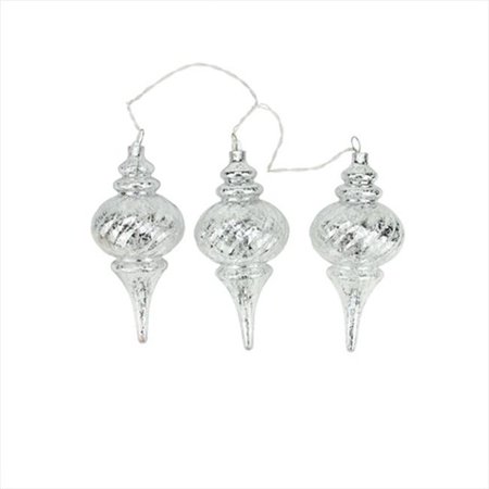 <p>These unique shatterproof finials feature a mercury glass finish. Shatterproof ornaments combine the beauty and luster of real glass with the unbreakable practicality of plastic.</p> <b>Features</b> <ul> <li>Color - clear bulbs / white wire</li> <li>Number of finials - 3</li> <li>Total number of bulbs on string - 20</li> <li>Bulb size - Mini</li> <li>Spacing between each finial - 9.5 in.</li> <li>Lighted length - 1.5 ft.</li> <li>Total length - 2.5 ft.</li> <li>12 in. lead cord</li> <li>UL listed for indoor or outdoor use</li> <li>Steady burning bulbs</li> <li>Contains 1 plug with end connector which allows you to stack multiple sets of lights together (not to exceed 210 watts)</li> <li>Comes with replacement bulbs and spare fuse</li> <li>Ornaments come ready-to-hang with silver hooks</li> <li>Wire gauge - 22</li> <li>120 volts, 60 hertz, 0.08 amps & 9.6 watts</li> <li>Dimension - 9.75 H x 4.5 W in.</li> <li>Materials - Plastic light covers/glass bulbs/wire/metal</li> <li>Set of 3</li> </ul>- SKU: GDNC8095