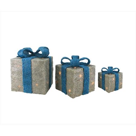 <b>Features</b> <ul> <li>Pre-lit with a total of 40 clear lights</li> <li>Bulb size - Mini</li> <li>Includes</li> <ul> <li>(1) 6 in. 10-light gift box</li> <ul> <li>52 White cord</li> <li>120 volts, 60 hertz, 0.07 amps & 8.4 watts</li> </ul> <li>(1) 8 in. 10-light gift box</li> <ul> <li>52 White cord</li> <li>120 volts, 60 hertz, 0.07 amps & 8.4 watts</li> </ul> <li>(1) 10 in. 20-light gift box</li> <ul> <li>52 White cord</li> <li>120 volts, 60 hertz, 0.08 amps & 9.6 watts</li> </ul> </ul> <li>Made from sisal - a fibrous and durable material</li> <li>Dusted with sparkling glitter throughout for a shimmering finish</li> <li>If one bulb burns out the rest will stay lit</li> <li>Boxes are all separate and each have a plug with an end connector which allows you to connect them together or use separately (not to exceed 210 watts)</li> <li>Wire gauge - 22</li> <li>UL listed for indoor/outdoor use</li> <li>Comes with replacement bulbs and spare fuses</li> <li>Ground stakes not included</li> <li>Materials - Sisal/metal/glass bulbs/wire</li> <li>Color - Brown</li> <li>Size - 6, 8 & 10 in.</li> <li>Set of 3</li> </ul>- SKU: GDNC8123