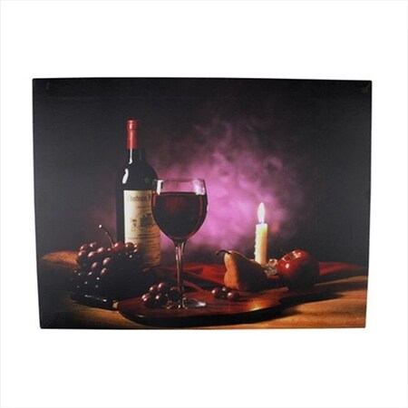 Are you looking for a majestic work of art? This creative canvas wall art is a true Gentleman's choice! Accenting on your walls, it describes your love for philosophy and art. Product Features. Purple lighted flickering wall art. Portrays an inviting scene with a bottle of red wine, a glass poured. Sitting on a cheese board, next to grapes and a taper candle. Candle is illuminated from behind the canvas by 1 amber LED light. Light flickers creating the illusion of a real candle. Comes ready-to-hang with a hook on the back. Convenient on/off switch on the side. Requires (2) AA size batteries - not included. Recommended for indoor use only Dimensions: 11.75"H x 15.75"W x 0.75"D. Material(s): canvas/wood/MDF