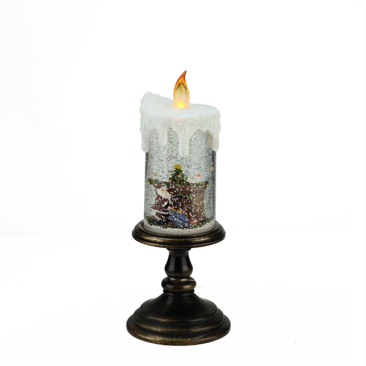 Enhance your holiday decor with this charming Christmas candle Glittering Snow Dome. The flickering amber flame gives a realistic look. Iridescent glitter floats inside lending a wintry, Christmas morning feel. This clear, glitter filled candle sits atop a brushed bronze pedestal base. Inside the candle Santa stands with his sack of presents by a fireplace decorated with a small Christmas tree. The candle is illuminated by a flickering amber light which also highlights the scene inside. Requires: (3) "AA" batteries (not included). Convenient on/off switch on base Dimensions: 10.25"H x 4.25"W x 4.25"D. Material(s): plastic/acrylic
