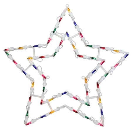 Brighten up your window decor this holiday season with this star-shaped window silhouette. It's the perfect way to brighten your decor with very little work. Simply attach the suction cup to a window, place the silhouette on the suction cup, and add some illuminated style to your holiday. Product Features: Color: Multicolor Bulbs/White Wire. Number of bulbs: 50. Bulb size: mini. 24 inch white lead wire. Unilateral design. Durable and reusable. Wire Gauge: 22 Additional Product Features: Super Bright Bulbs. UL listed and approved for indoor or outdoor use. If one bulb burns out, the rest will stay on. Comes with spare bulbs, spare fuses, and a suction cup for mounting. Contains 1 plug with end connector that allows you to stack multiple lighted items together (not to exceed 210 watts). Wire gauge: 22. 120 volts, 60 hertz, .17 amps, 20.4 watts Dimensions: 16"H x 16"W x .75"D. Materials: plastic/wire/glass bulbs