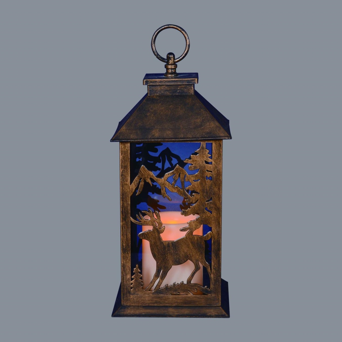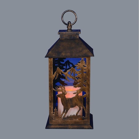 Add a rustic warm touch to your home or lodge with this buck in the wilderness flame-less candle lantern. This candle lantern casts a warm glow throughout your space. Makes a great gift for the country lovers in your circle or a great addition to your own decor! Product Features. Silhouette of a majestic buck in the wilderness. Perfect for holiday decorating or country decor. Recommended for indoor use - if using outdoors place under a covered area. Measures 13.5" high from the bottom to the top of the upright ring. Uses three (3) "AAA" size batteries - not included Dimensions: 13.5"H x 5.5"W x 5.5"D Material(s): plastic/metal