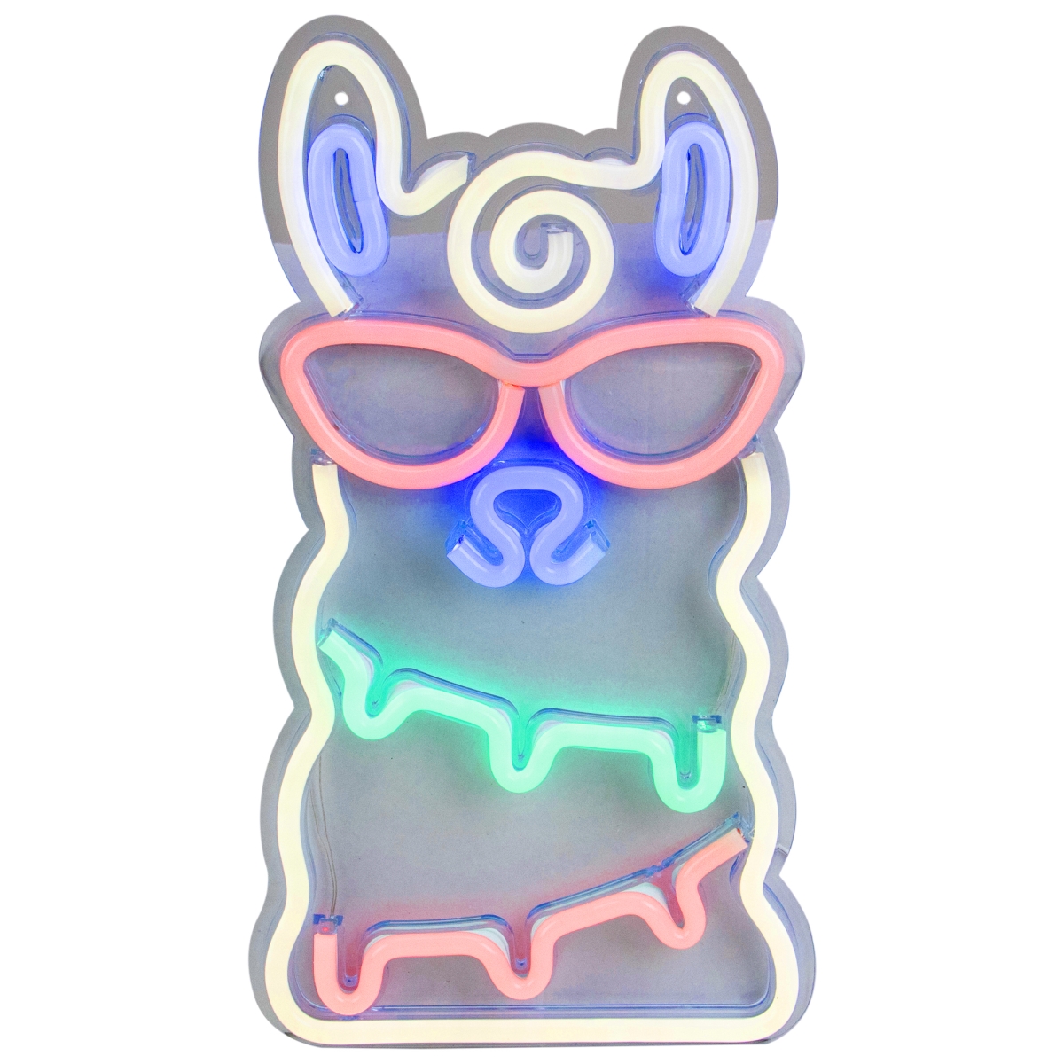 Give your home a fresh and hip look with this unique wall sign. It features a white llama with red sunglasses and blue and green accents. Perfect way to show off your fun side while you dress up the room. Product Features:. Color(s): green, white, red, orange and blue. LED bulb type: SMD 2835. Approximate thickness: 8mm. Approximate width: 11mm. Double-sided design. LED lights use up to 80% less energy. Super bright, vibrant bulbs. Bulbs stay cool to the touch. 6.75' lead cord Additional Product Features:. UL certified and approved for indoor use only. Cannot be connected together with other lighted items. Comes ready-to-hang with two keyhole hooks at the top. Suction cups and hanging hardware not included. Powered by the included 5V USB cord. Does not include USB power adapter Dimensions: 15"H x 8"W x 3"D. Material(s): plastic/silicone/wire/metal