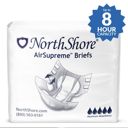 Loaded with features to satisfy the needs of the most demanding situations, NorthShore AirSupreme Briefs come in a wide range of sizes from X-Small to X-Large. Features include Air Breathable for maximum skin health, Wide Coverage, Maximum Absorbent Capacity, tall Stand-up Leak Guards, Anti-odor protection, Waterproof Breathable Side Panels, Microsorb Lining, a comfortable elastic waistband, and more. Latex-Free. Made in the EU. (Case of 4 packs of 20)