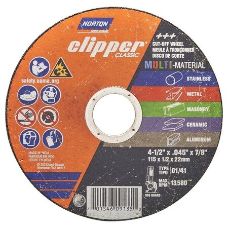 Norton Clipper 70184609135 Norton Clipper Classic Ac Ao/Sc Series Cut-off Wheel, 4-1/2 Inch By 0.045 in Thick, 7/8 in Arbor (701846091350-1)