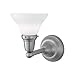 Features Constructed from steel Comes with a frosted glass shade (1) 100 watt maximum medium (E26) bulb required Dimmable with compatible dimming bulbs UL rated for damp locations Covered under a manufacturer 2 year warranty Dimensions Height: 10" Width: 6" Extension: 9-1/2" Shade Height: 3-7/8" Shade Depth: 6-3/8" Backplate Height: 5-1/8" Backplate Width: 5-1/8" Electrical Specifications Max Wattage: 100 watts Number of Bulbs: 1 Max Watts Per Bulb: 100 watts Bulb Base: Medium (E26) Bulb Included: No