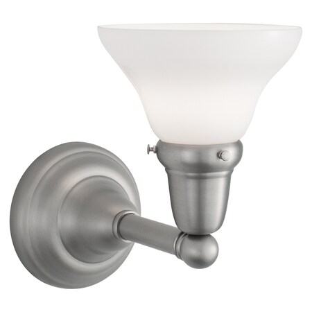 8124-BN-SO Finish: Brushed Nickel Pictured in oil rubbed bronze Features: -One light indoor wall sconce. -Coventry collection. -Available in Brushed Nickel, Chrome or Oil rubbed bronze finish. -Constructed of brass and shiny opal glass. -Shade shape: Bell. -Contemporary and classic style. -Light direction: Up or down. -UL listed for dry locations. Specifications: -Accommodates (1) 100W incandescent Edison base bulb. -Shade dimensions: 3.875'' H x 6'' D. -Overall dimensions: 10'' H x 6'' W.