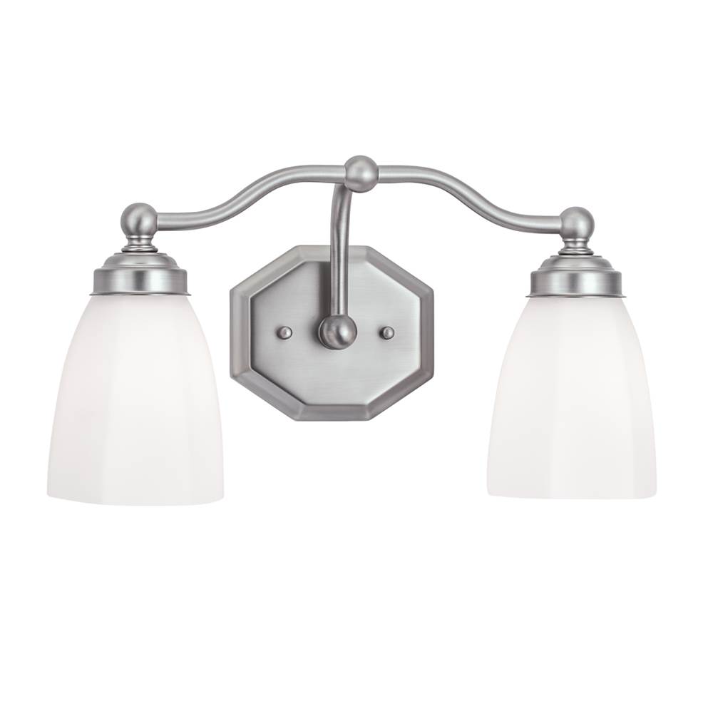 8319-BN-HXO Finish: Brushed Nickel Pictured in double opal shade and chrome finish Features: -Two light indoor bath vanity. -Trevi collection. -Available in Brush Nickel or Chrome finish. -Constructed of brass and glass. -Shade shape: Hexagon. -Contemporary and classic style. -Light direction: Up or down. -UL listed for dry locations. Specifications: -Accommodates (2) 75W incandescent Edison base bulb. -Shade dimensions: 5.625'' H x 4.375'' D. -Overall dimensions: 8'' H x 17'' W.