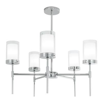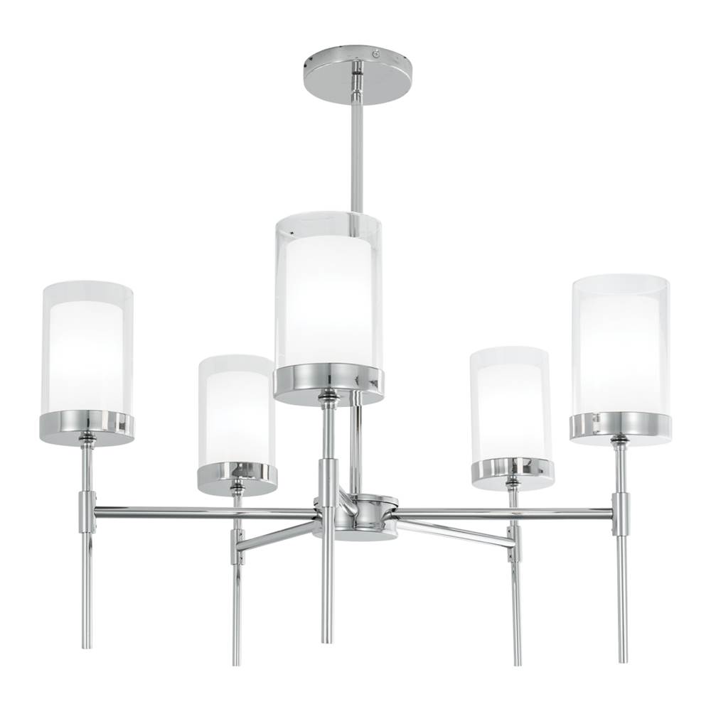 8971-PN-CL Contemporary / Classic style 5 light Kimberly Pendant in Polish Nickel finish with Clear Outer Glass/White Inner Glass diffuser. A refined five –arm candelabra pendant with gracious dual-layered glass diffusers and long stem design. The Kimberly pendant is a timeless light that will add a touch of elegance to bathrooms, dinning rooms and hallways. Light Bulb Data: 5 Incandescent 60 watt. Bulb included: No. Dimmable: yes.