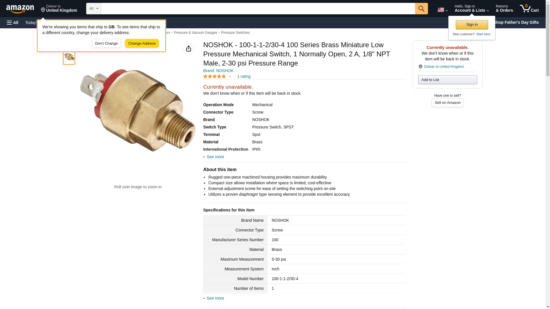 NOSHOK 100 Series Brass Miniature Low Pressure Mechanical Switch, 1 Normally Open, - 2 A, 1/8" NPT Male, 5-30 psi Pressure Range