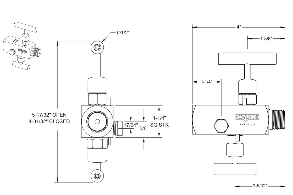2 Valve Block & Bleed, Hard Seat, 1/2 NPT Male - 1/2 NPT Female, 316 SS, 0.187" Orifice, SS Tag