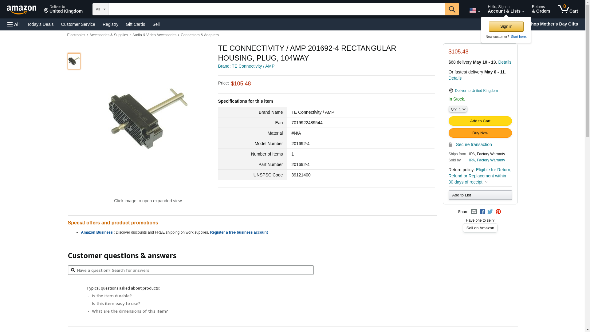 | Feature | TE CONNECTIVITY / AMP 201692-4 RECTANGULAR HOUSING, PLUG, 104WAY |