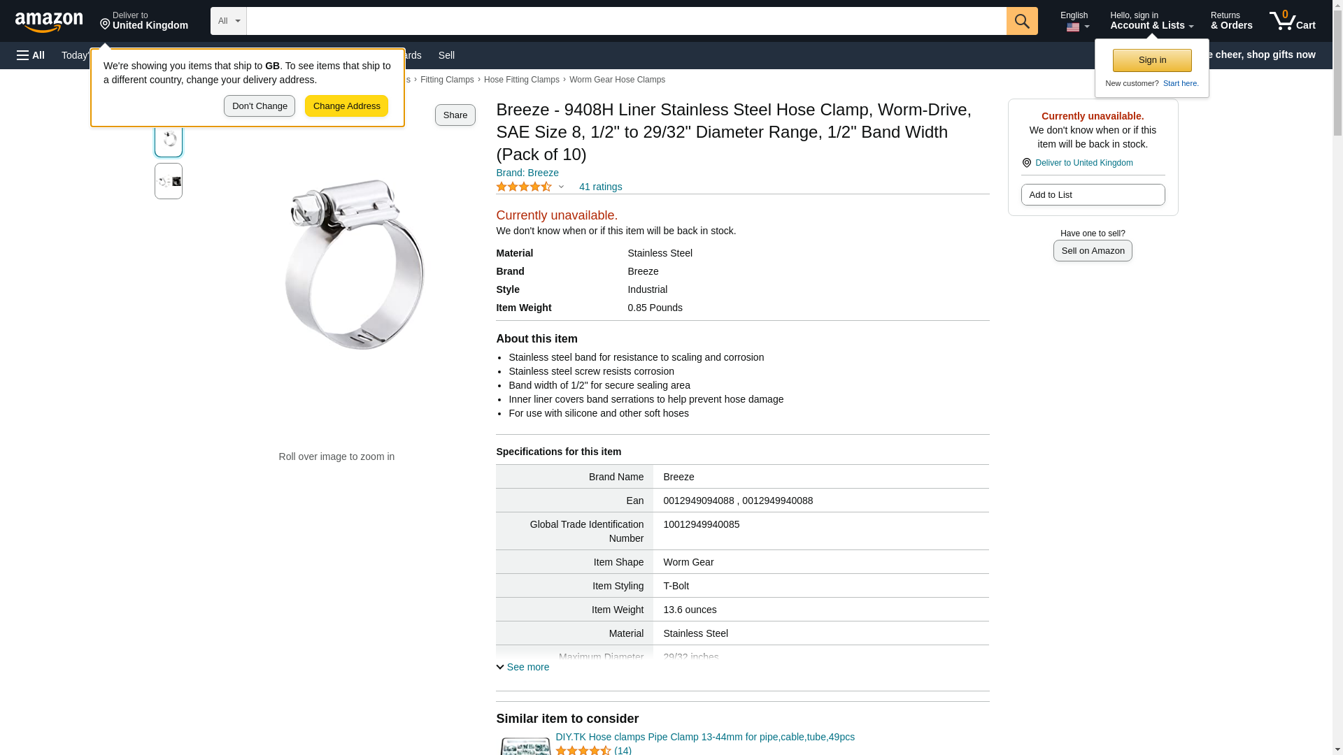Breeze Liner Stainless Steel Hose Clamp, Worm-Drive, SAE Size 8, 1/2" to 29/32" Diameter Range, 1/2" Band Width (Pack of 10)