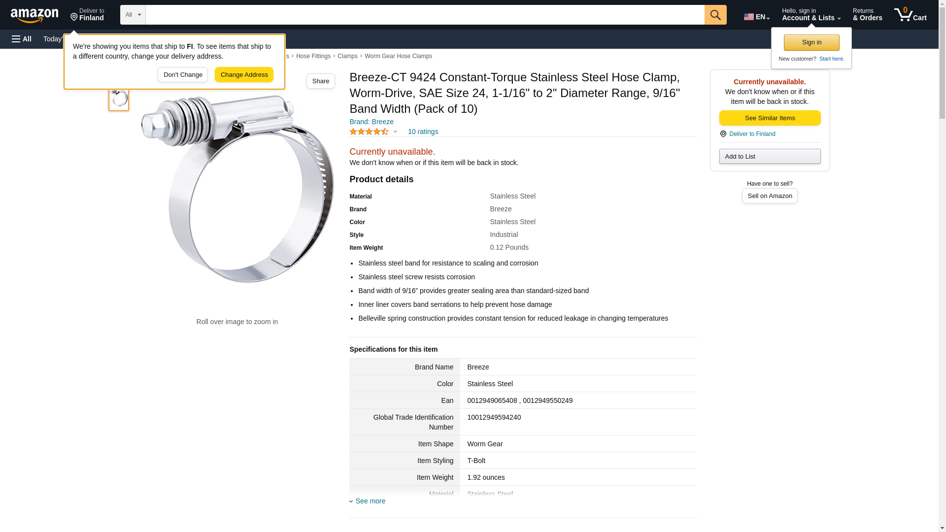 Breeze Constant-Torque Stainless Steel Hose Clamp, Worm-Drive, SAE Size 24, 1-1/16" to 2" Diameter Range, 9/16" Band Width (Pack of 10)