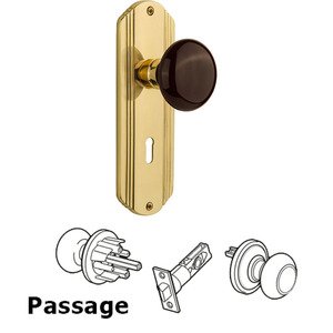 Deco Collection - Passage Deco Plate with Keyhole and Brown Porcelain Door Knob in Polished Brass by Nostalgic Warehouse - 710294 | MyKnobs