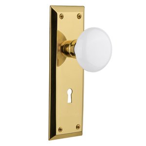 New York Collection - Passage New York Plate with Keyhole and White Porcelain Door Knob in Polished Brass by Nostalgic Warehouse - 712129 | MyKnobs