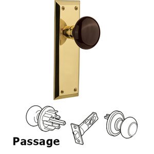 New York Collection - Passage New York Plate with Brown Porcelain Knob in Unlacquered Brass by Nostalgic Warehouse - 717039 | MyKnobs