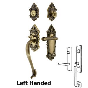 Nostalgic Warehouse 771344 Victorian Plate S Grip with Left-Handed Fleur Lever Entry Set, Backset Size: 2-3/8", Antique Brass