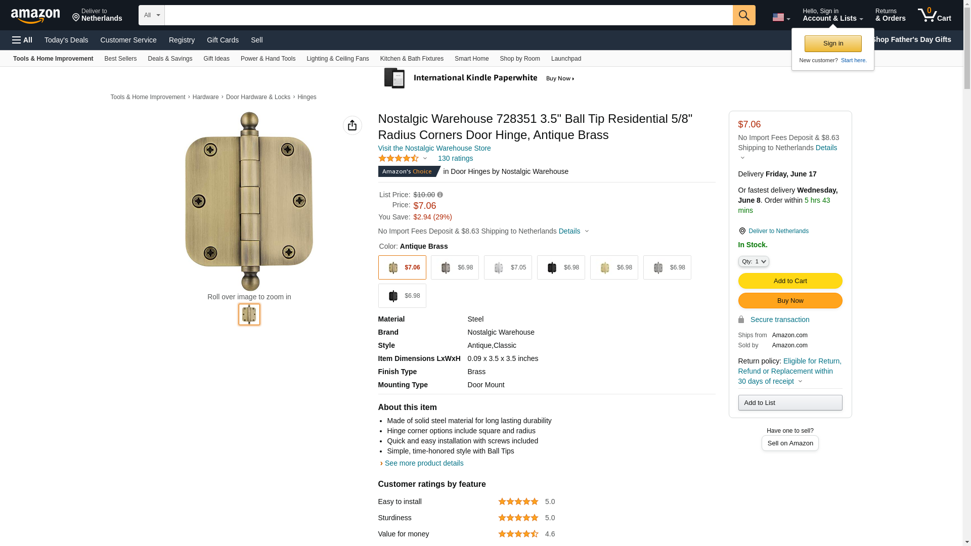 Residential Hinges Collection - 3 1/2" Ball Tip Residential Hinge with 5/8" Radius Corners in Antique Brass (Sold Individually) by Nostalgic Warehouse - 728351 | MyKnobs