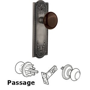 Nostalgic Warehouse - Passage Knob- Meadows Plate with Brown Porcelain Knob without Keyhole in Antique Pewter
