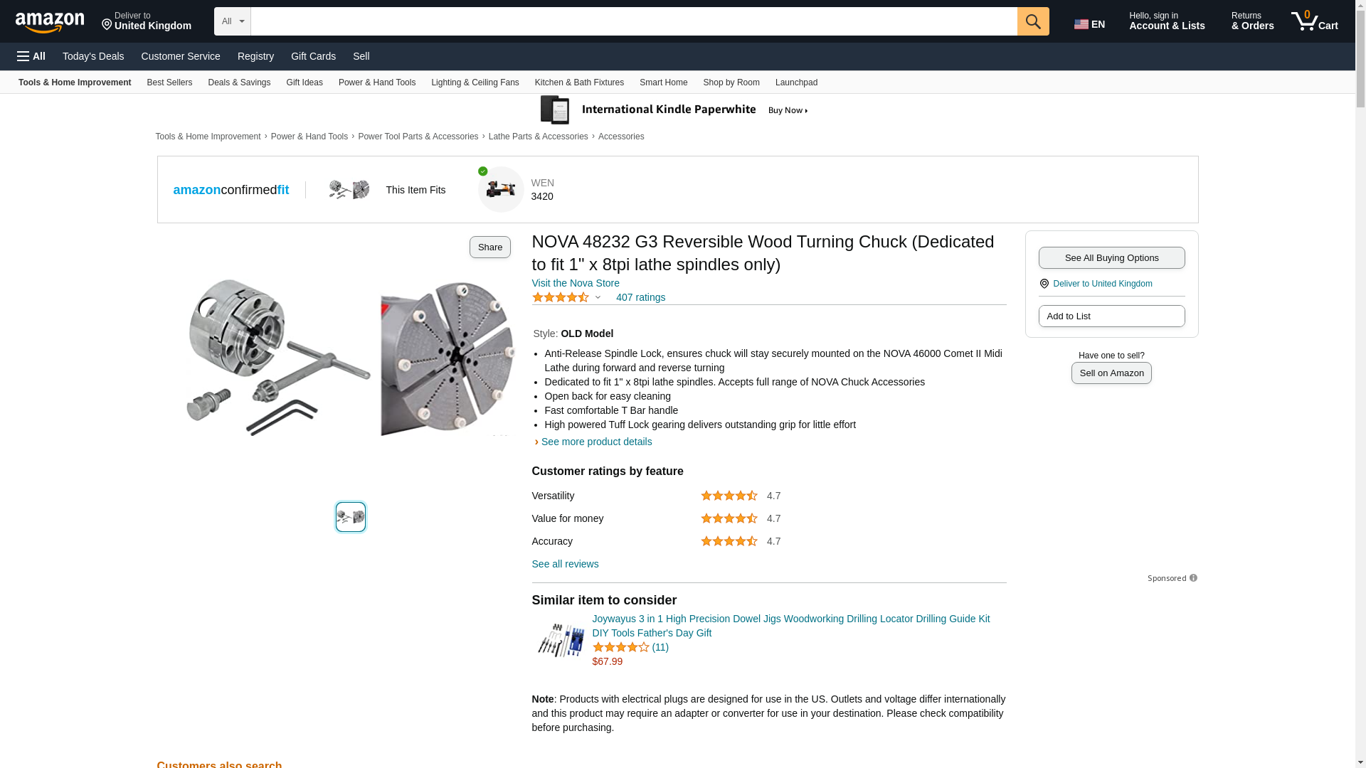 NOVA 48232 G3 Reversible Wood Turning Chuck is a 4 in. Jaw self centering geared chuck, exclusively designed for the NOVA 46000 Comet II Midi Wood Lathe. It comes with a Reverse Lock feature that enables the chuck to be locked securely onto the lathe spindle when using the forward and reverse functions on the NOVA 46000 Comet II Wood Lathe. It has a dedicated 1 in. 8TPI thread and is only able to be used on the NOVA 46000 Comet II Wood Lathe. This chuck comes standard with the unique NOVA features such as Auto Stop, Copper composite Jaw Slides, Woodworm Screw, Comfortable T Bar Handle and 2 in. Jaws as standard, this chuck is fully featured. Powerful Tuff Lock gearing with precise, hardened action delivers incredibly smooth strength for a solid, vibration free performance. Takes the same accessory range as other NOVA Chucks. Awarded Best Value in Chuck Test by Wood Magazine Sept 2011. Designed by the innovators of the 4 Jaw Chuck for wood turning, Teknatool International - since 1955. Backed by a full replacement 2-year warranty, call our customer service center toll free on 1-866-748-3025.