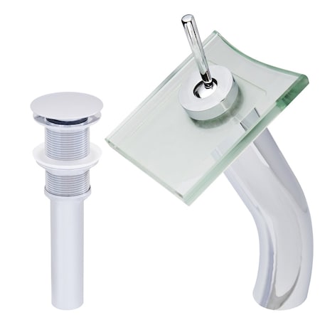 - Waterfall vessel faucet with chrome finish and clear glass, pop-up drain, mounting ring and Glacier Ice Sealer
