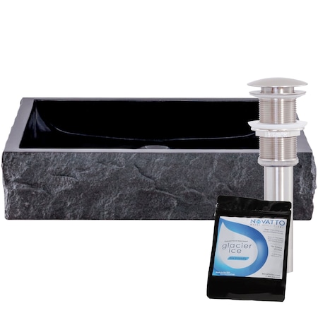 Inspired by the outdoor elements, driven by functional design. Novatto's black granite vessel will add charm to any bath. Our granite vessels come from around the world to become your one-of-a-kind bath masterpiece. This 18-inch square vessel has a natural chiseled exterior with a polished inside. Black granite is very consistent and little variation should occur from sink to sink. These sinks are designed for above-counter installation. A unique gravity flow drain is positioned on center in the front of the sink. This drain has a 1.75-inch opening for standard connections. Included with the sink is Novatto's brushed nickel umbrella drain, constructed of solid brass for strength and durability.For easy maintenance apply the included Glacier Ice sealer. This will help seal the pores in the stone to prevent water spotting. For best cleaning results, a soft cloth with mild soap and water or a non-abrasive stone cleaner is recommended. Novatto strives to provide superior products with exceptional qualities and unique innovations professionals and homeowners trust.