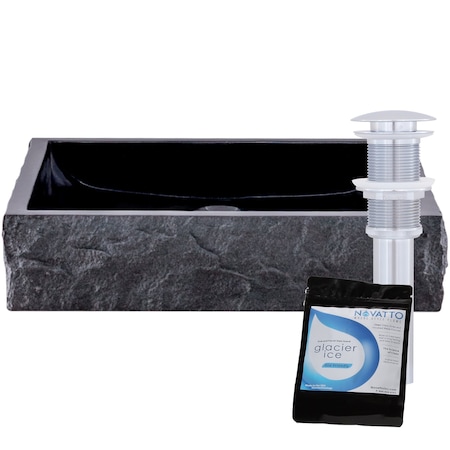 Novatto (NOVB0) Square Black Granite Vessel Sink with Chiseled Exterior and Chrome Drain (NOSV-ANSQCH)