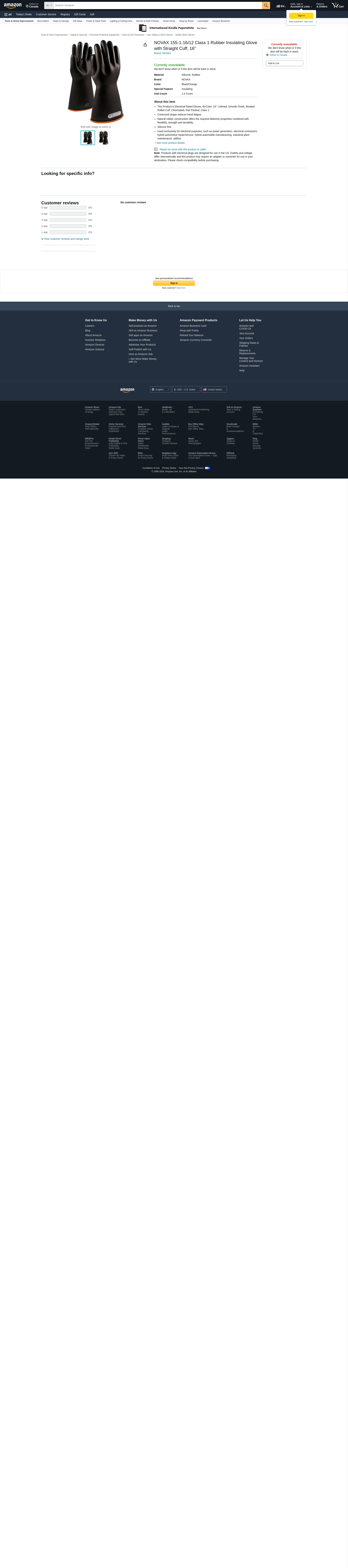 NOVAX 155-1-16/12 Class 1 Rubber Insulating Glove with Straight Cuff, 16"