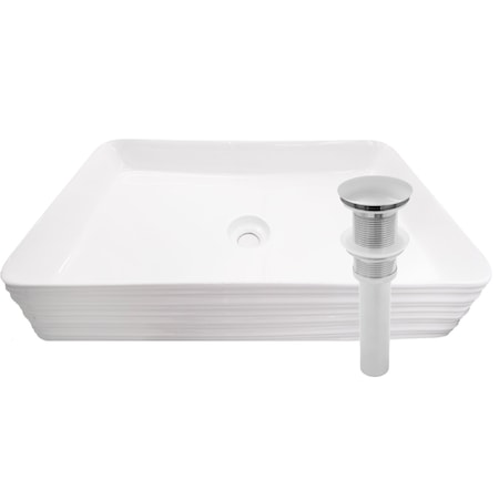 - Rectangular bright white glossy porcelain vessel sink with grooved sides; No overflow