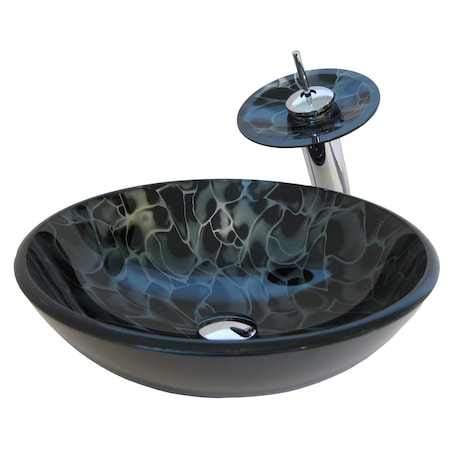 Enhance and harmonize your bath with Novatto's hand painted glass vessel and matching chrome waterfall faucet. The Tartaruga vessel features a bold hand-painted tortoise shell design of black and silver. Novatto uses advanced technology, including computerized glass processing and Italian furnaces, to produce glass basins of unmatched structural integrity. This vessel sink and faucet combo is a great way to harmonize the decor by unifying the color and textural design of your bathroom. The matching faucet disc directs the water flow into a graceful waterfall. When a bath demands superior design and quality, Novatto's glass vessels add that touch. Each glass sink and faucet features its own beauty of color, structural character and texture, adding a sense of purity, elegance and distinctive look to any design. Glass vessel sinks can be used either in a powder room as a focal point or in a master bedroom for everyday use. Novatto?s tempered glass cannot be compared to the everyday synthetic porcelains and ceramics. The glass vessel is constructed from thick half-inch high tempered glass. The waterfall faucet is constructed from solid brass with a high pressure ceramic cartridge. Faucet is AB1953 Low Lead compliant. A single handle controls temperature and water flow. This sink and faucet set is designed for an above-counter, single-hole installation. The sink has a 1.75-inch drain opening for standard U.S. plumbing connections. A matching chrome mounting ring and 1.5-inch pop-up drain are included. Glass Vessel Dimensions: 16.5" x 5.5", Overall Faucet Height: 13.25-inches; Spout Height: 8.625 inches; Spout Reach: 3.625 Inches.