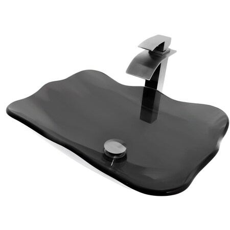 Upgrade the bath with Novatto's clear grey elegant glass vessel and matching gun metal waterfall faucet. This clear grey glass vessel set is a great way to harmonize your decor by unifying the color and textural design of the bathroom. This vessel faucet beautifully compliments the style lines of the sink. Each glass sink and faucet features its own beauty of color, structural character and texture, adding a sense of purity, elegance and distinctive look to any design. This sink has a standard 1.75-inch drain opening on center with no overflow. A 1.5-inch hole is needed for the faucet installation. Glass vessel sinks can be used either in a powder room as a focal point or in a master bedroom for everyday use. The rectangular glass vessel is constructed from thick high tempered glass. The faucet is constructed from solid brass with a high pressure ceramic cartridge. A single handle controls temperature and water flow. This sink and faucet set is designed for an above-counter, single-hole installation with standard plumbing connections. A matching gun metal mounting ring and 1.5-inch pop-up drain are included. Glass Vessel Dimensions: 20" x 15" x 5.5"; Overall Faucet Height: 11.5-inches; Spout Height: 8-inches; Spout Reach: 3.75-inches. Faucet is AB1953 Low Lead Compliant. Apply the included Glacier Ice sealer to keep it looking like new!