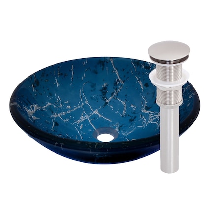 - Blue marbled glass vessel sink with brushed nickel hardware