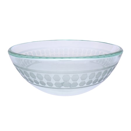 TIS-158 Features: -Bathroom sink. -Material: Tempered glass. -Round clear vessel with etching. -Modern style. Installation Type: -Vessel sink. Style: -Modern. Sink Shape: -Circular. Finish: -Cream. Material: -Glass. Number of Faucet Holes: -0. Dimensions: Overall Length - Side to Side: -16.5". Overall Width - Front to Back: -16.5". Overall Depth - Top to Bottom: -5.75". Overall Product Weight: -14 lbs.