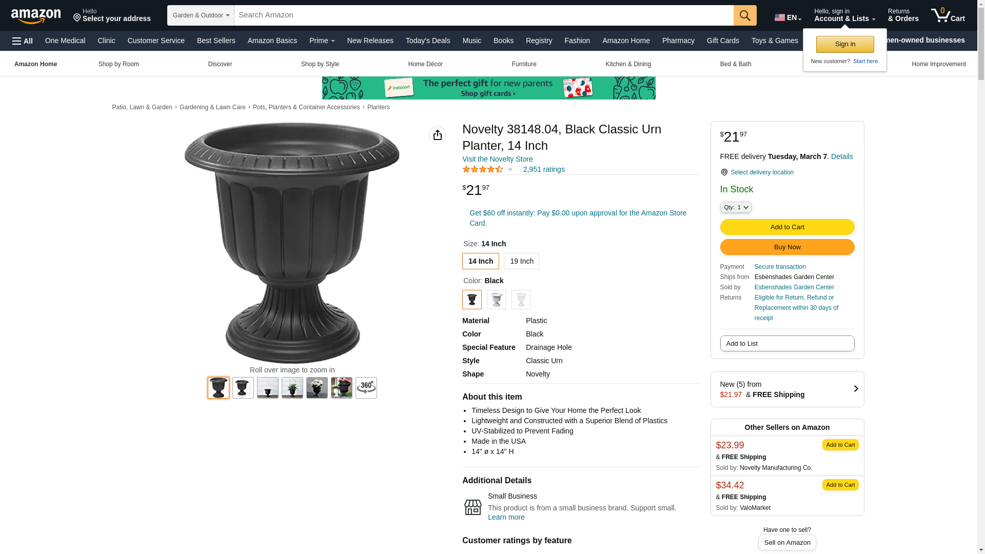 Novelty 38148 14 Inch Blk Classic Urn (026978381484-2)