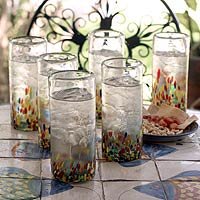 NOVICA, in association with National Geographic, searches the world to work directly with the finest artisan designers. "We have fun doing what we do - but more so when the design of a glass is as entertaining as this," confide Javier and Efrn as they talk about the "Confetti" collection. This set of six highball glasses is adorned with bright bursts of color setting the mood for celebration. Because each piece is handmade, shape and size can vary slightly and tiny bubbles may appear within the glass. This exemplifies the hand-blown technique, making every piece a unique example of blown glass craftsmanship.