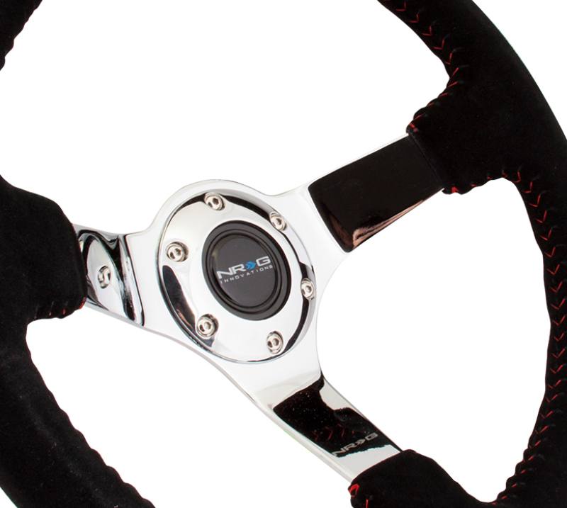 NRG Reinforced Sport Steering Wheel 350mm 3 Inch Deep black Suede with red Baseball Stitching Chrome Spoke | RST-036CH-S