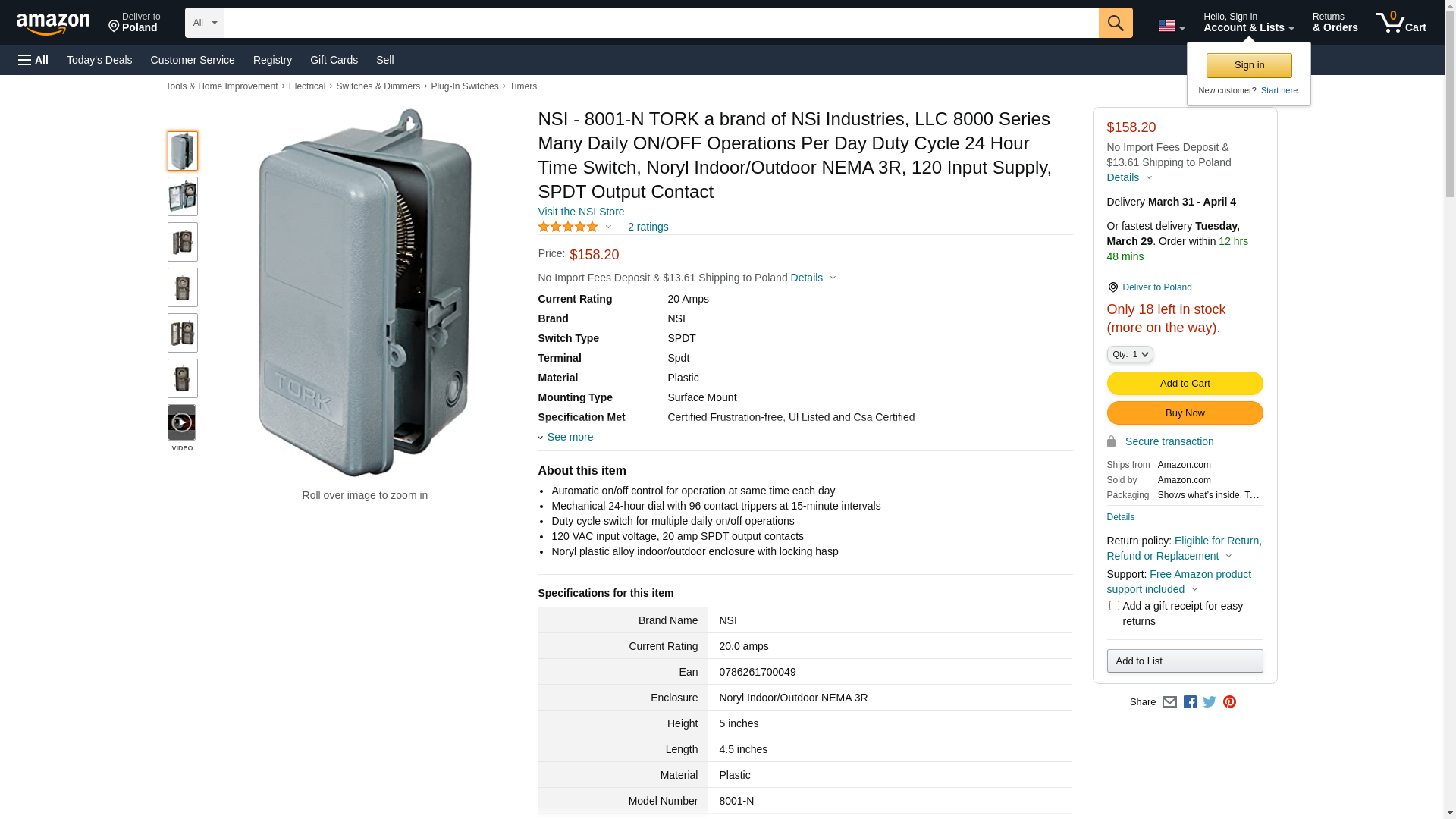 NSI - 8001-N TORK a brand of NSi Industries, LLC 8000 Series Many Daily ON/OFF Operations Per Day Duty Cycle 24 Hour Time Switch, Noryl Indoor/Outdoor NEMA 3R, 120 Input Supply, SPDT Output Contact