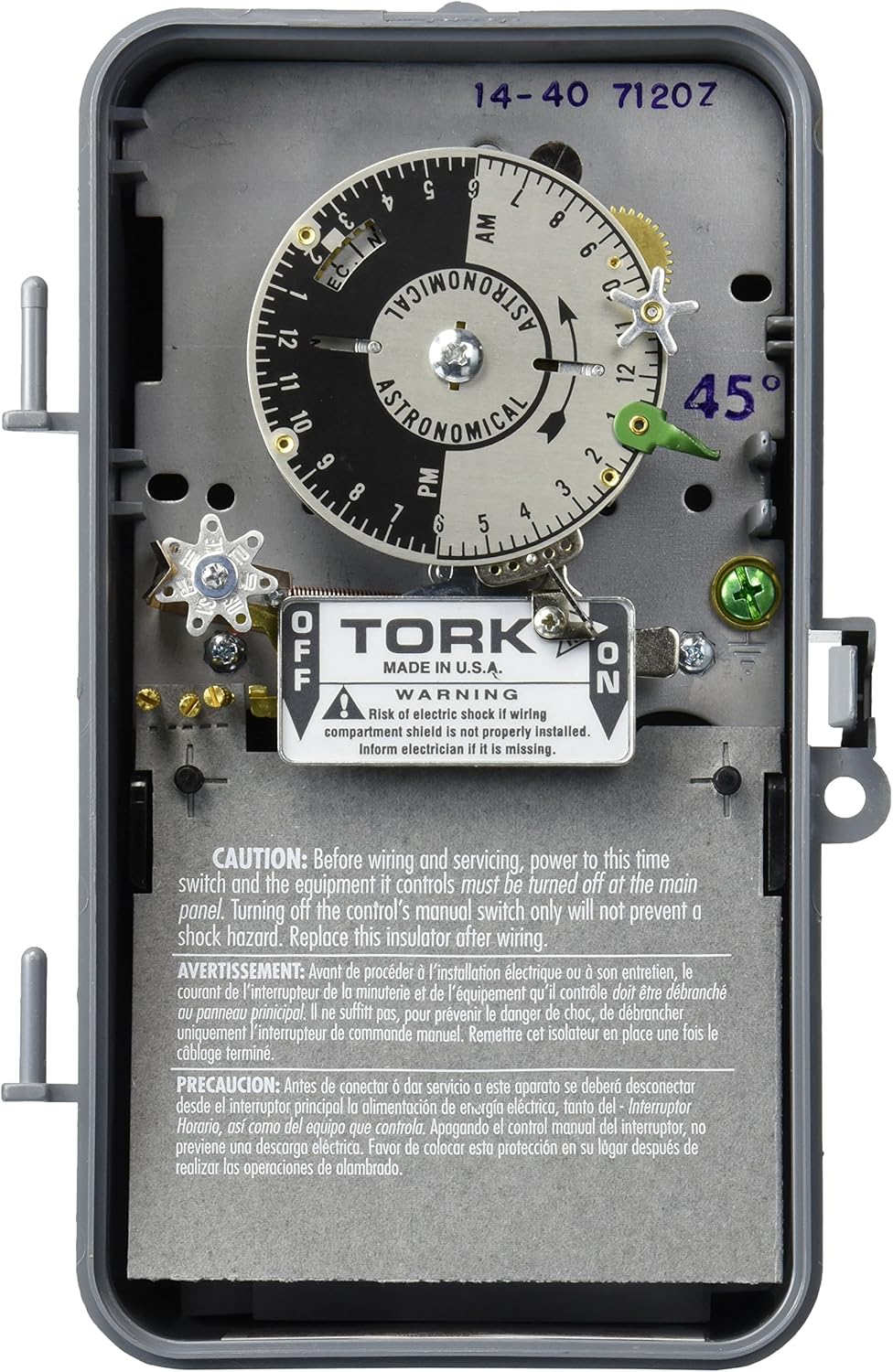 Tork 7120Z-45 SunSet with Skip-A-Day Astronomic Time Switch - 45 Degrees This is only to be used on a clock located in the 45 degree latitude zone (or call Tork at 888-500-4598 for the correct part for your location).APPLICATIONS:Parking Lots, Walkways, Outdoor Signage, Window Displays, Canopy Lighting, Landscape Lighting Automatic ON at dusk, OFF at dawn. Control of outdoor lighting. FEATURES: INPUT VOLTAGE: 120 VAC 60 Hz OUTPUT CONTACTS: SPDT TIMING ACCURACY: Line frequency TERMINAL RANGE: #8 - #14 AWG OPERATING TEMPERATURE: -40 degrees to 165 degrees F (-40 degrees to +74 degrees C) POWER CONSUMPTION: 3 watts maximum SunSet ASTRONOMIC: Adjusts daily to changes in sunset times. Turn ON at sunset and OFF at sunrise daily. OFF time can be set from 8:30PM to 2:30AM. Can be individually offset + / - 20 or 40 minutes from both sunset and OFF times. TRIPPERS: Comes with (1) set of trippers ( 1 ON and 1 OFF). Additional trippers can be purchased under Part # P49. SKIP-A-DAY: Omit operations on any day with a 7-spoke wheel marked with days of the week. 3 omitting screws included. MANUAL OVERRIDE: Until the next regularly scheduled ON or OFF, automatic operation then resumes. ENCLOSURE: Lockable hasp. Noryl Indoor/Outdoor NEMA 3R OTHER MOUNTINGS: Intermatic Adaptor Plate model #IAP allows adaptation to an Intermatic case. MANUFACTURER: Tork PART NUMBER: 7120Z-45 UPC: 786261230096 CONTACT RATINGS: GENERAL PURPOSE: 120VAC Single Phase. Contact Rating 40A RESISTIVE: 120VAC Single Phase. Contact Rating 40A TUNGSTEN: 120VAC. Contact Rating 40A BALLAST: 120VAC Single Phase. Contact Rating 20A PILOT DUTY: 120VAC. Contact Rating 1000VA MOTOR: 120VAC Single Phase. Contact Rating 2HP We have timers to fit your every need, with the best selection and prices.