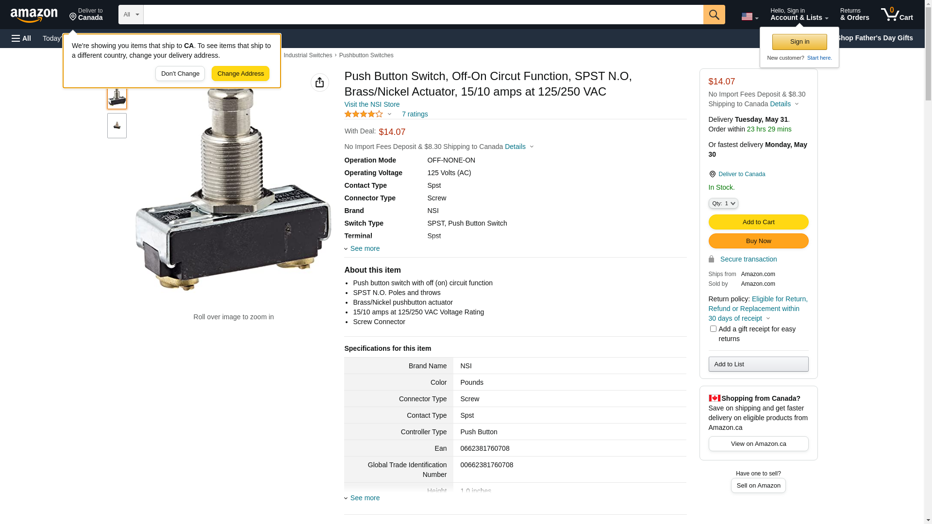 NSI 76070PS Push Button Switch, Off-On Circuit Function, SPST N.O, Brass/Nickel Actuator, 15/10 amps at 125/250 VAC