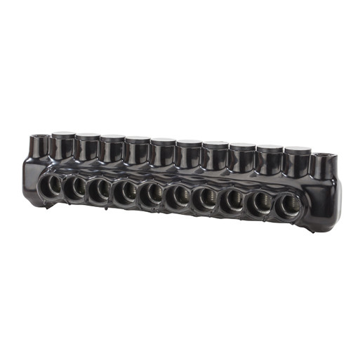 10 Wire Polaris 500 MCM-4 AWG Insulated Multi-Cable Connector with Mounting Holes, Either Side Wire Entry Polaris Insulated Multi-Cable Connectors have wire entry ports on both sides of the connector to allow for access from either side. Mounting holes at each end of the connector allow for direct isolated mounting to the trough, panel or wireway. IPLMD Series connectors are insulated with high-dielectric strength plastisol. Molded for precise fit and supplied with removable access plugs over the hex screws. Eliminates the need for cover and taping. Abrasion and chemical resistant. UV resistant. Will not support combustion. Mounting holes will accept a 1/4" bolt for 3/0 AWG and a 5/16" bolt for 250 MCM and 350 MCM. UL Listed 486B Wire Connector. AL9CU. Cold temperature rated to -45 degrees C, rated 600V, 90 degrees C. Dual rated for use with copper and/or aluminum cables. Not recommended for fine-stranded, flexible wire. SPECIFICATIONS: QUANTITY: 1 Count COLOR: Black RATED: 600 Volts NO. OF PORTS: 10 WIRE ALIGNMENT: Either Side WIRE RANGE: 500 MCM-4 AWG LENGTH: 13.52 in. WIDTH: 2.81 in. HEIGHT: 3.03 in. TORQUE VALUE: 450 HEX SIZE: 5/16 BRAND EQUIVALENT: Blackburn AMTDM500410 Ilsco PBTD-10-500-M Morris 97870 Penn Union IPBM-NA600-10D MANUFACTURER: NSi Industries PART NUMBER: IPLMD500-10 UPC: 662381945082 We have the best selection and prices on connectors.