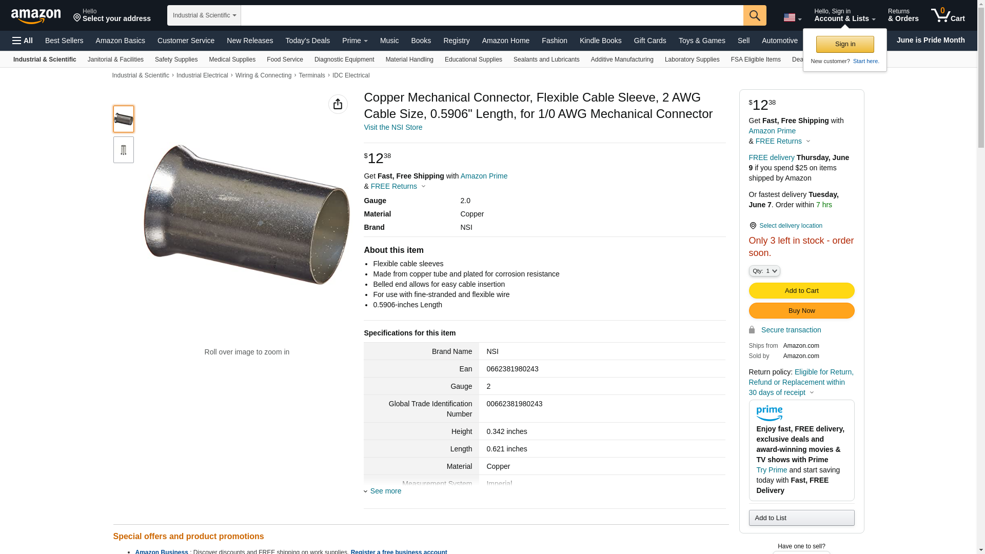 NSI FS002 Copper Mechanical Flexible Cable Sleeve for 1/0 AWG Mechanical Connector, 2 AWG Cable Size, 0.5906" Length